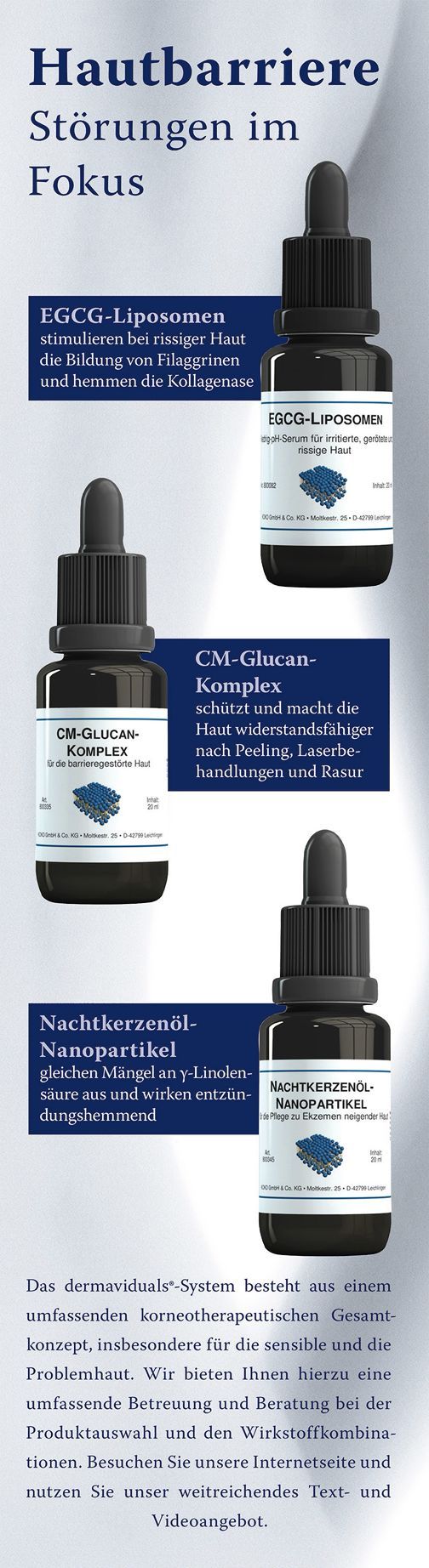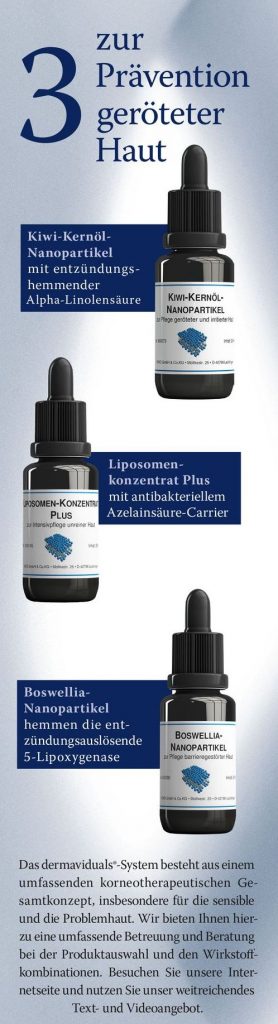 Dieses Konzept basiert auf modernster dermatologischer Forschung und macht Dermaviduals zu einer idealen Pflege für sensible, anspruchsvolle und problematische Haut ebenso wie für die tägliche, nachhaltige Hautgesundheit.
