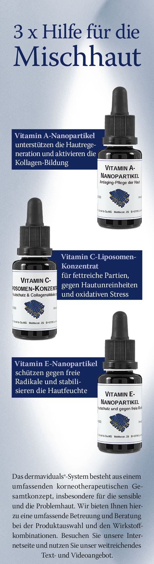 Wir freuen uns, Ihnen mit Dermaviduals einen außergewöhnlichen Partner im Bereich der dermatologischen Kosmetik vorstellen zu dürfen.